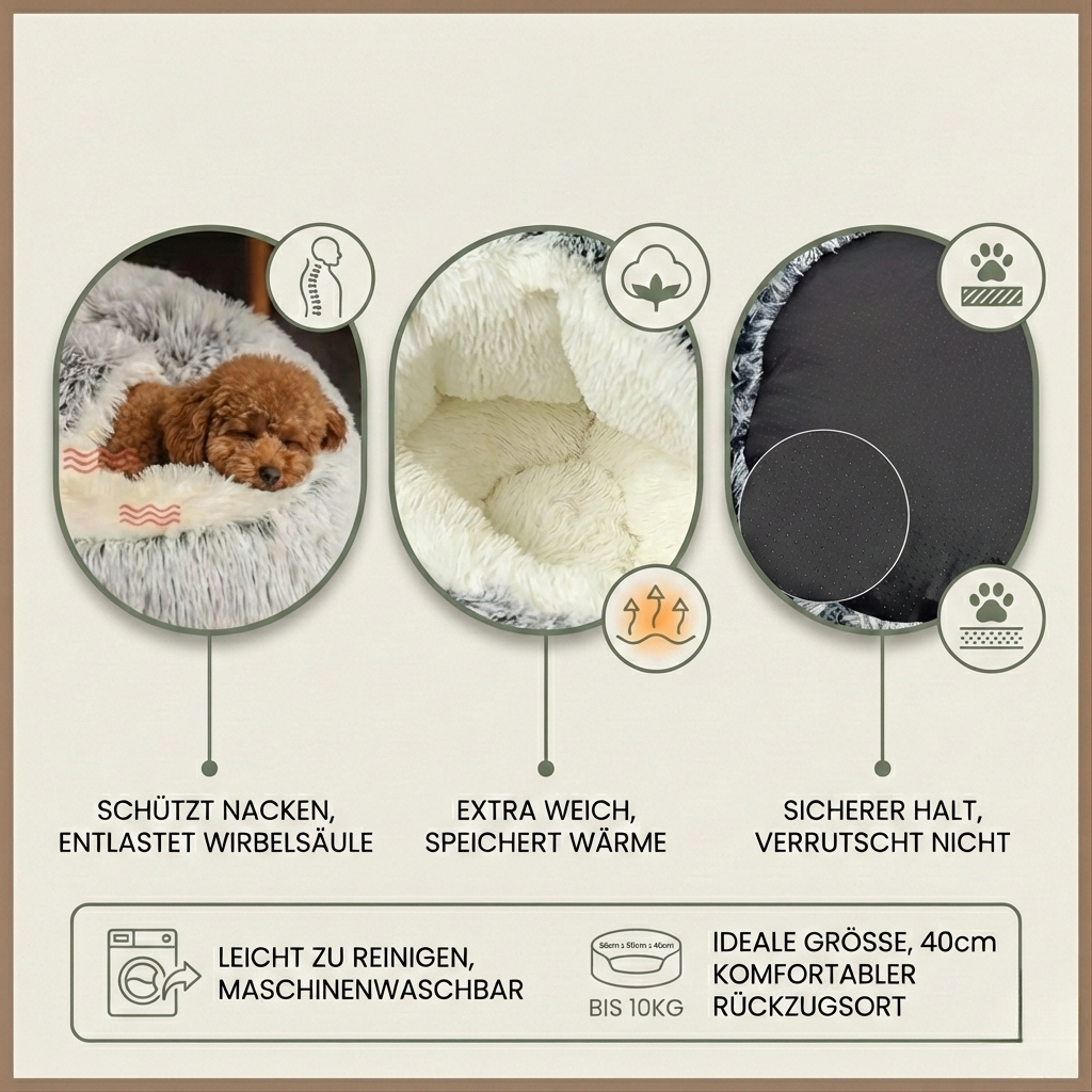 Das Hundebett ist aus hochwertigem Plüsch gefertigt, weich gepolstert und sorgt für maximalen Komfort. Die tiefe, nestartige Form gibt kleinen Hunden ein sicheres Gefühl, während die rutschfeste Unterseite Stabilität auf glatten Böden garantiert. Perfekt für Hundehütten, Körbchen oder als eigenständiger Ruheplatz im Wohnzimmer.